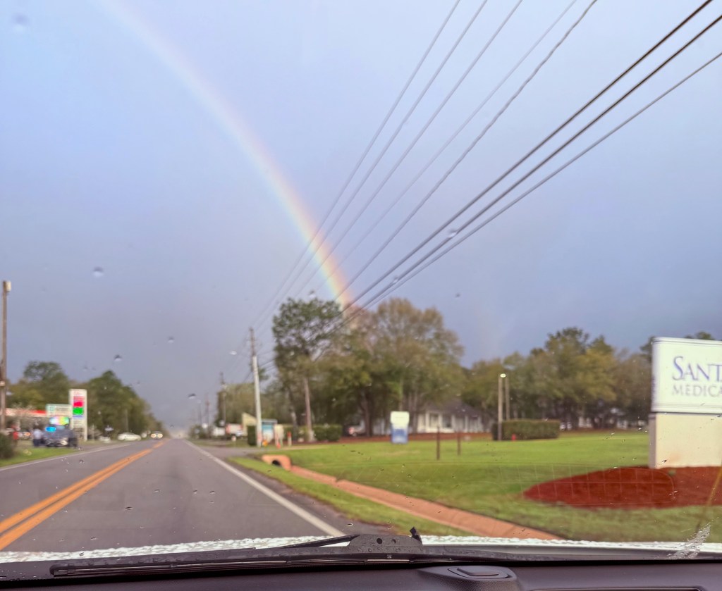 As I drove down Berryhill Road this morning, using the wipers to wipe away the dreary rain, there was the most colorful rainbow that grabbed my attention. Gray skies were pierced with an array of colors. Dreary weather was tempered with just a speck of sunshine behind a cloud. And the frown that I’ll admit was on my face turned upward for a moment into a smile. I was reminded that God sees. God knows. God cares. He’s up to something that I often can’t explain and have long stopped trying to figure out. But even when I can’t see it, he’s working, because he never stops working.